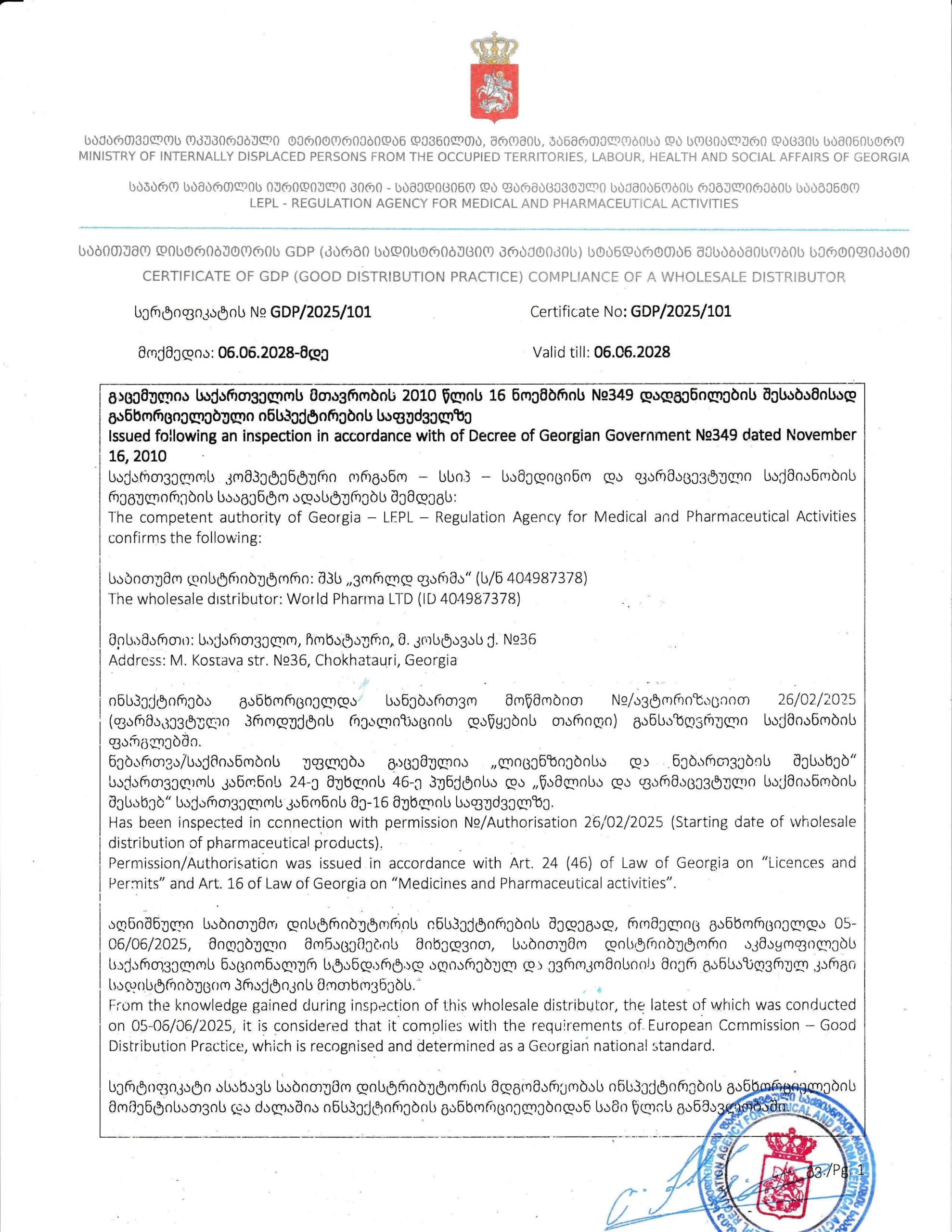 2025 წლიდან შპს “ვორლდ ფარმა“ ფლობს ნაციონალურ “კარგი სადისტრიბუციო პრაქტიკის“ (GDP) სერტიფიკატს.