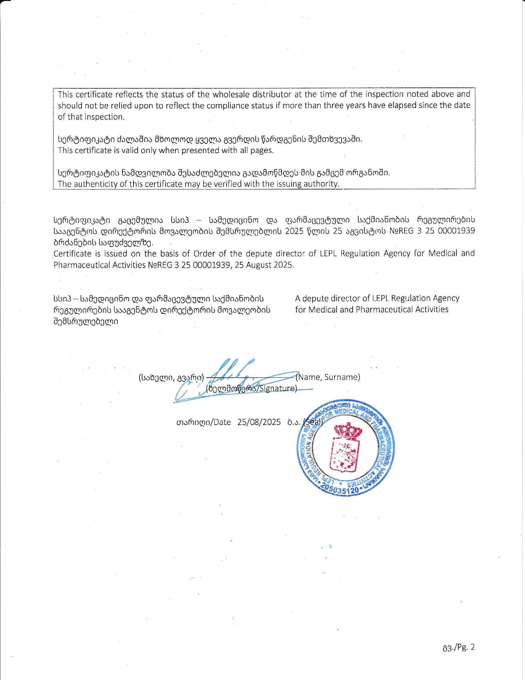 კომპანია 2021 წლიდან ფლობს საერთაშორისო ავსტრიული მასერტიფიცირებული ორგანოს TUV AUSTRIA GmbH-ის მიერ გაცემულ სერტიფიკატებს: ISO 9001:2015, EU-GDP, HACCP და ყოველწლიურად რესერტიფიცირებით ინარჩუნებს ორგანიზაციაში დანერგილ ამ საერთაშორისო სტანდარტებს.